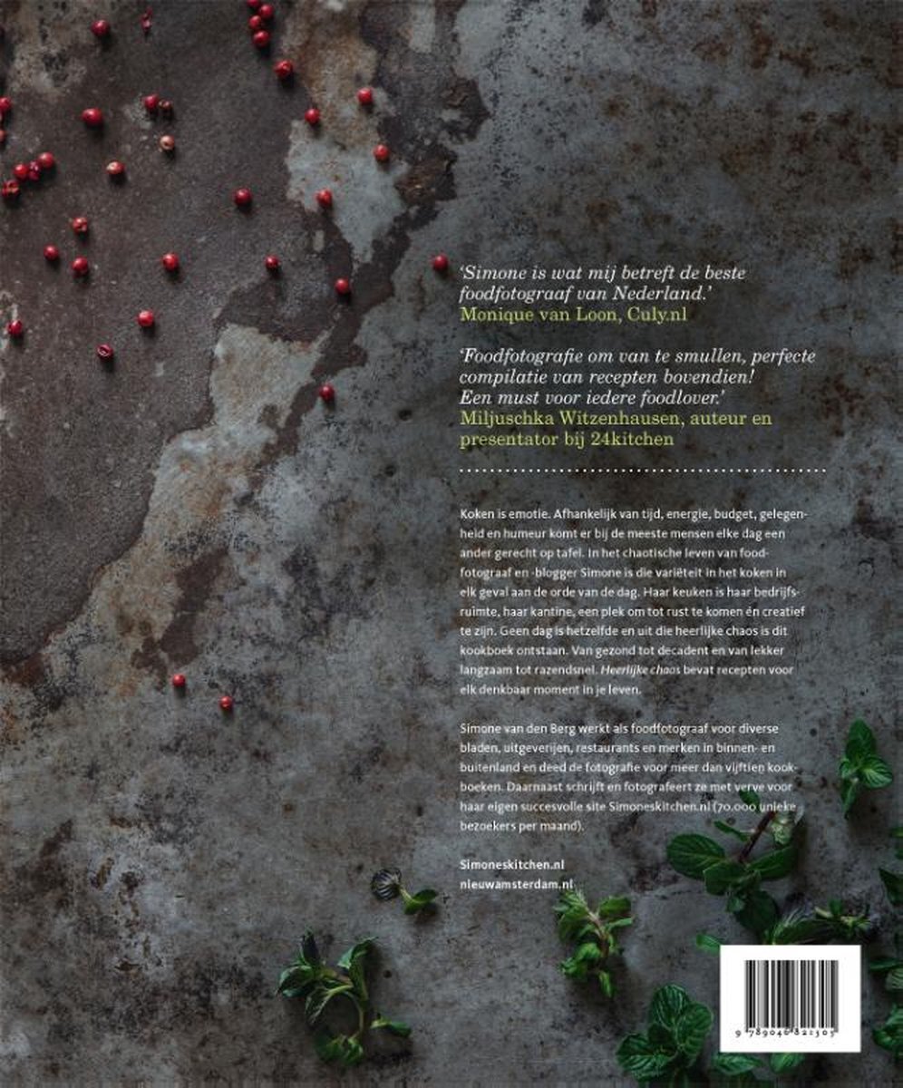 In het chaotische leven van foodfotograaf en -blogger Simone is die variëteit in het koken in ieder geval aan de orde van de dag. Haar keuken is haar bedrijfsruimte, haar kantine, een plek om tot rust te komen én creatief te zijn. Geen dag is hetzelfde en uit die heerlijke chaos is dit kookboek ontstaan. Van gezond tot decadent en van lekker langzaam tot razendsnel. Heerlijke chaos bevat recepten voor elk denkbaar moment in je leven.