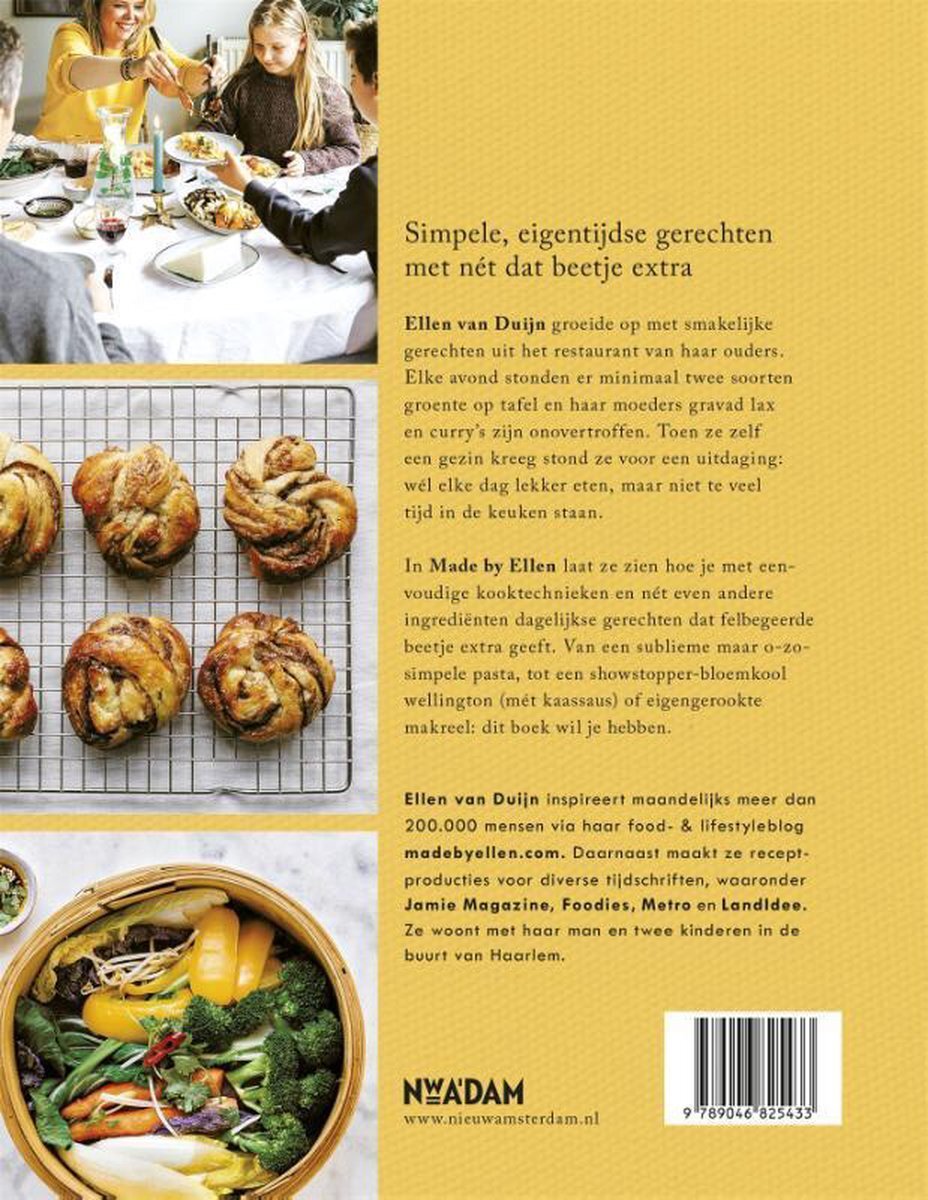 Ellen van Duijn groeide op met smakelijke gerechten uit het restaurant van haar ouders. Elke avond stonden er minimaal twee soorten groente op tafel en haar moeders gravad lax en curry's zijn onovertroffen. Toen ze zelf een gezin kreeg stond ze voor een uitdaging: wél elke dag lekker eten, maar niet te veel tijd in de keuken staan. In Made by Ellen laat ze zien hoe je met eenvoudige kooktechnieken en nét even andere ingrediënten dagelijkse gerechten dat felbegeerde beetje extra geeft. Van een sublieme maar o-zo-simpele pasta, tot een showstopper-bloemkool wellington (mét kaassaus) of eigengerookte makreel: dit boek wil je hebben.