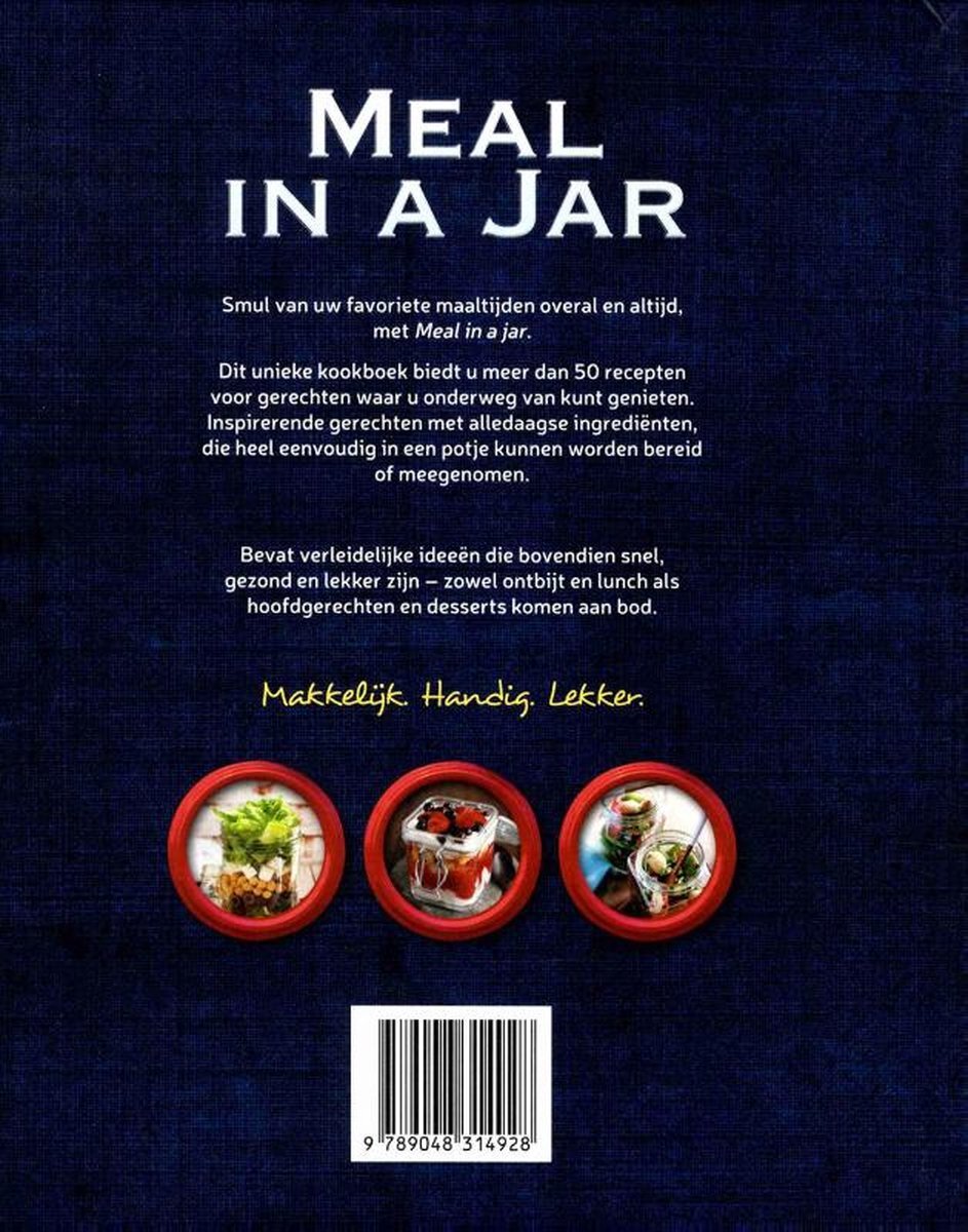 Meal in a jar Smul van uw favoriete maaltijden overal en altijd, met Meal in a jar. Dit unieke kookboek biedt u meer dan 50 recepten voor gerechten waar u onderweg van kunt genieten. Inspirerende gerechten met alledaagse ingrediënten, die heel eenvoudig in een potje kunnen worden bereid of meegenomen. Bevat verleidelijke ideeën die bovendien snel, gezond en lekker zijn - zowel ontbijt en lunch als hoofdgerechten en desserts komen aan bod. Makkelijk. Handig. Lekker.