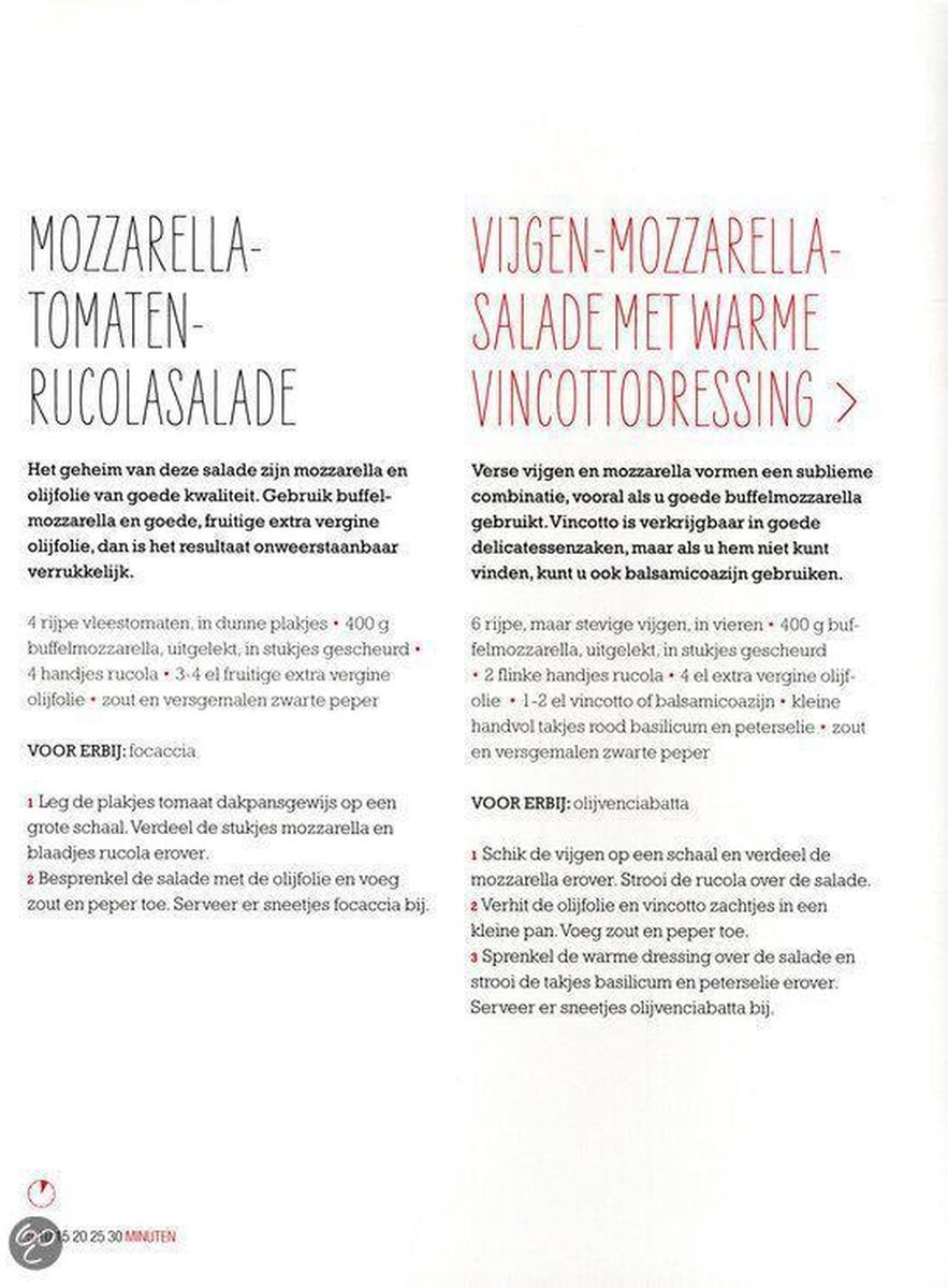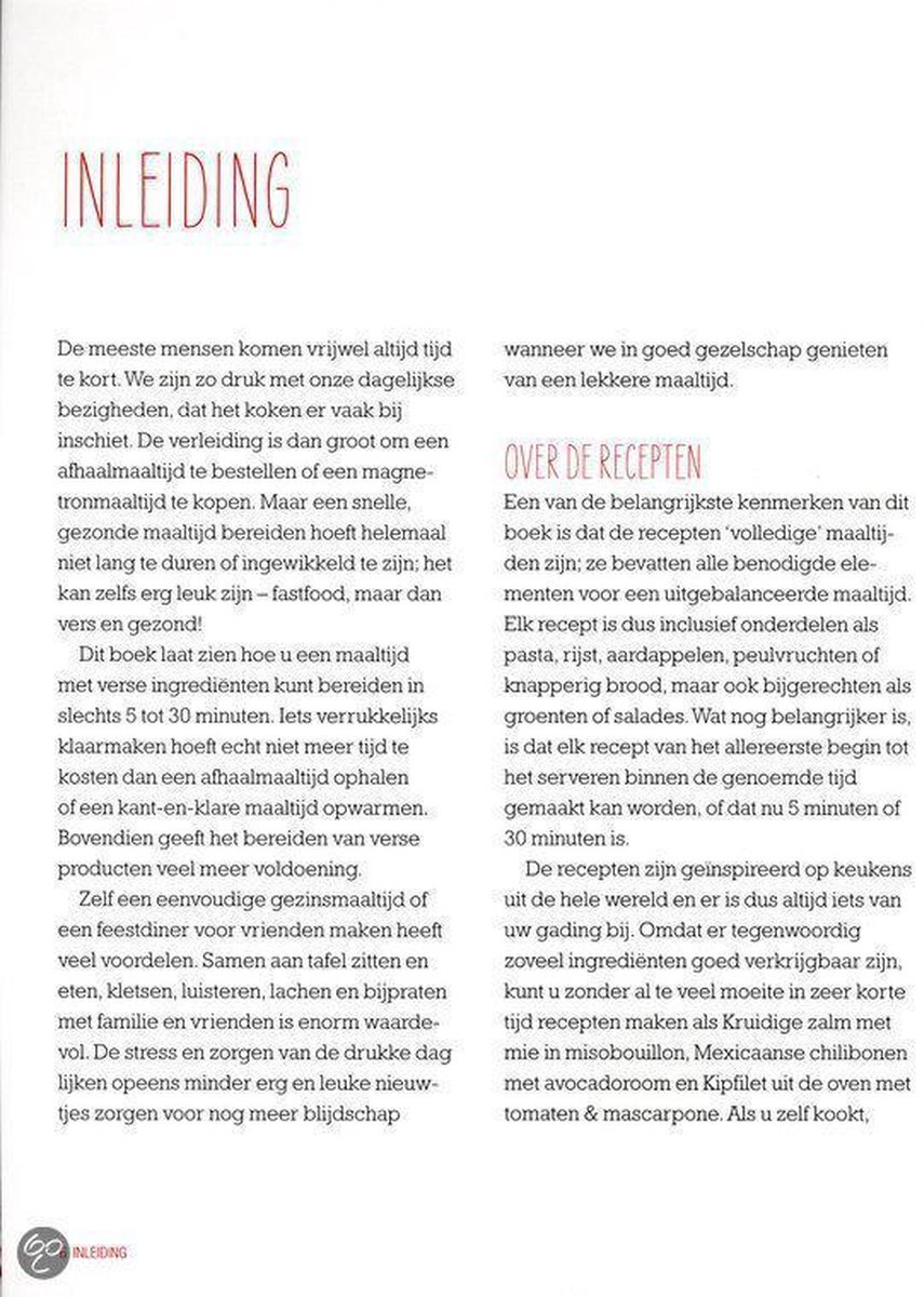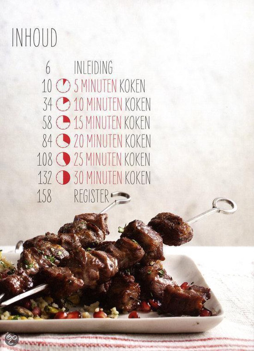 Met meer dan 175 recepten, verdeeld over zes handige hoofdstukken, kunt u gerechten maken die in 5, 10, 15, 20, 25 of 30 minuten klaar zijn van begin tot bord. In 5 minuten bijvoorbeeld een garnalen-erwtenroerbak of capellini met krab. In 10 minuten gezonde, snelle gerechten zoals open ricottalasagne of piadina-pizza margherita. Voor het weekend of speciale gelegenheden zijn er bijzondere gerechten van 30 minuten, zoals kiprolletjes met prosciutto of honingeend met granaatappelsaus.