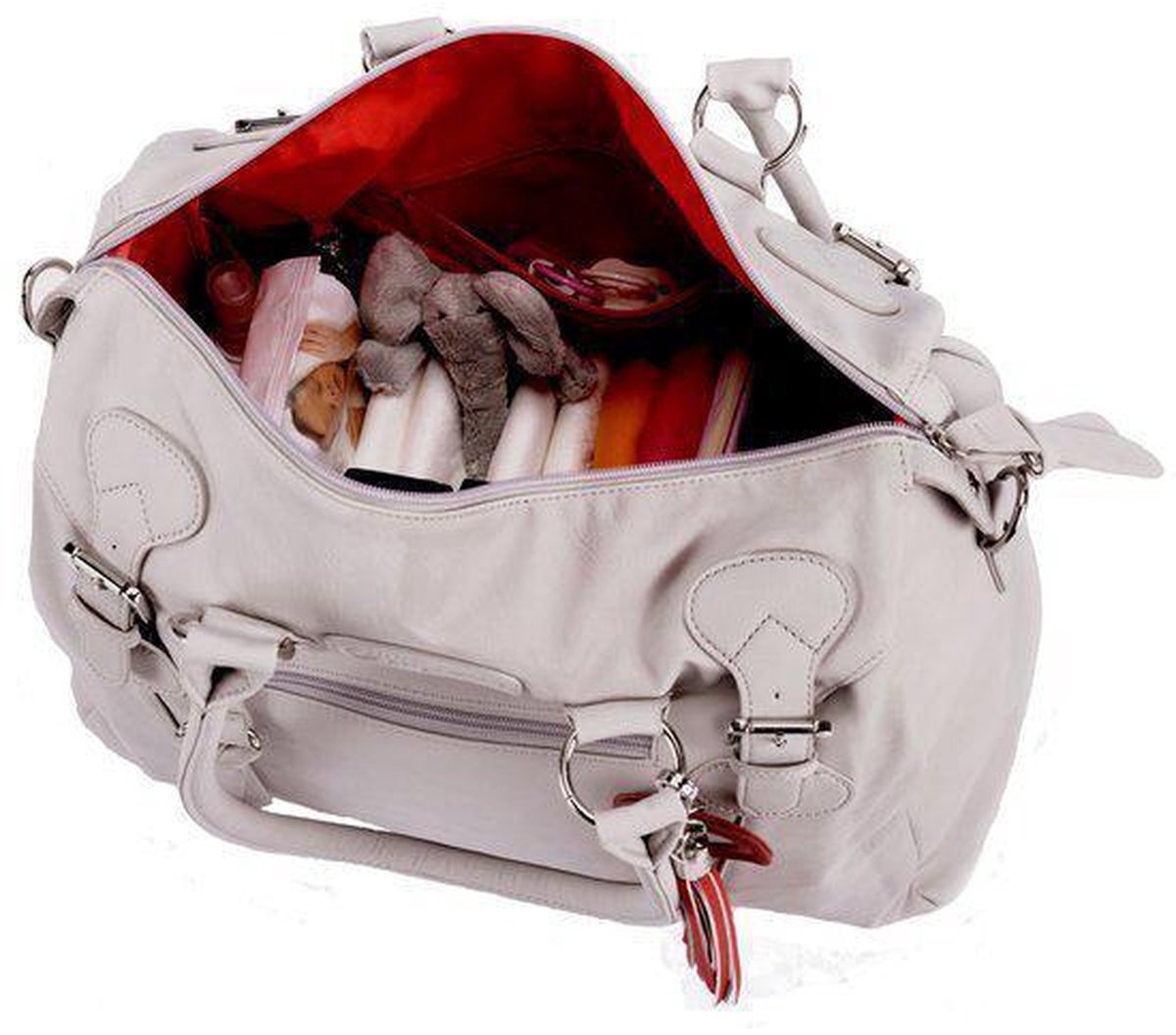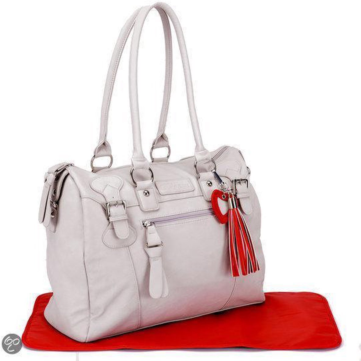 Deze taupe schoudertas met soft leather look heeft een leuke groene sleutelhanger, een verschoningsmatje, 2 geïsoleerde flessenhouders en diverse handige opbergvakken. Met de losse schouderriem met drukknopen kunt u de tas makkelijk bevestigen aan uw wagen of buggy.